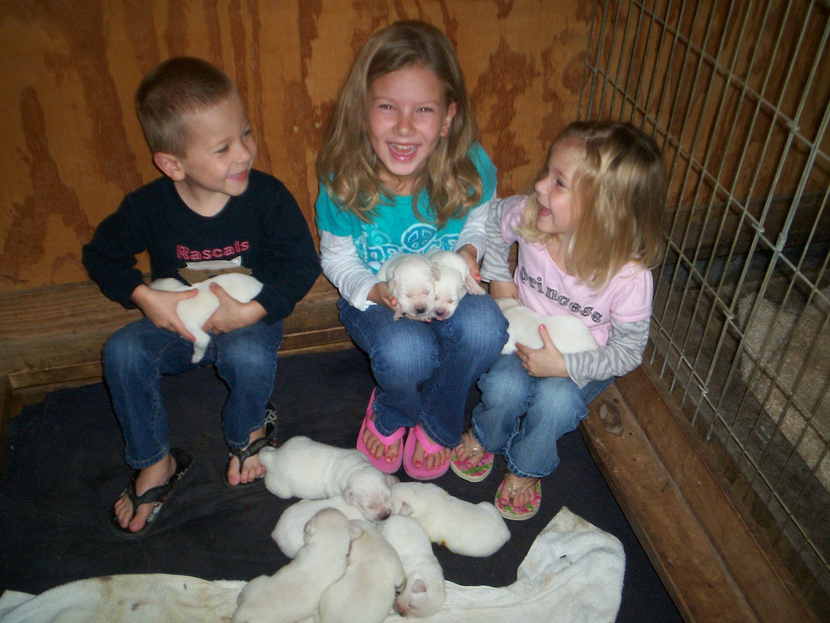 There is probably nothing better in life than the combination of white lab puppies & grandchildren to enjoy them. These two things make my world go around. All of Lizzie’s & Mona’s puppies that were born a few weeks ago now have deposits on them, so we are currently sold out. The next litter that I have planned should be born the end of May. So if you want a puppy for summer you better get your deposit in soon.