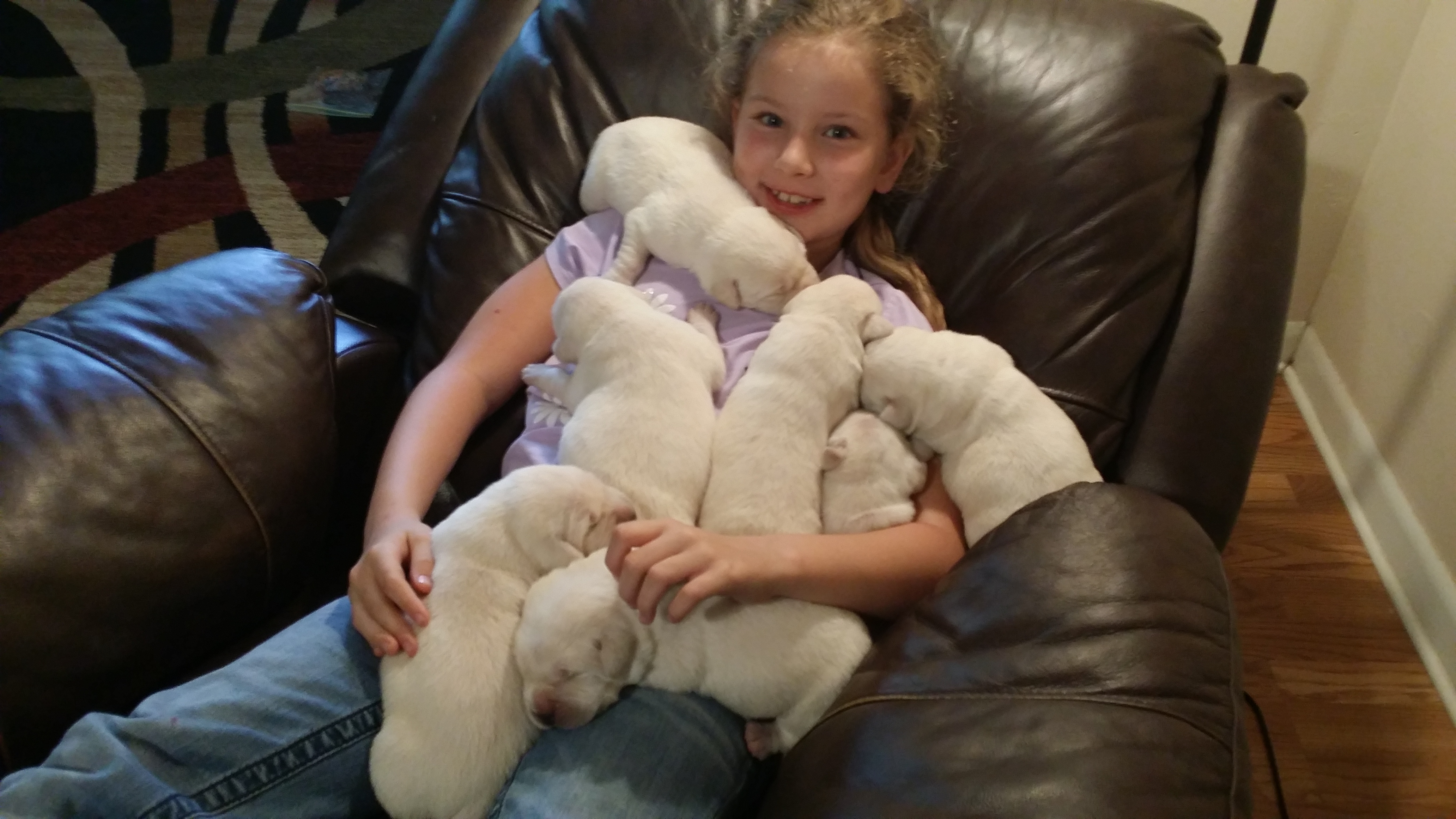 My granddaughter Brenna always has a hard time decideing which puppy to hold at this age they are all so cute. So I told her to have a seat & she could hold them all & she was thrilled. These puppies are almost 2 weeks old & will be going to their new homes at the end of May.