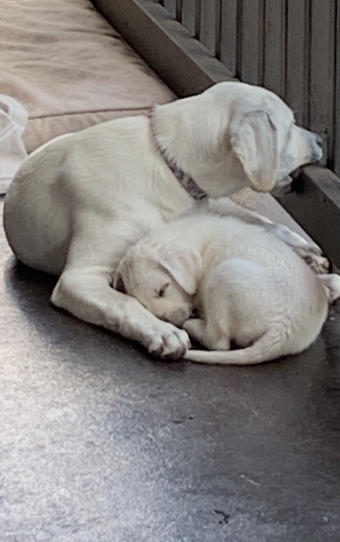 This photo was sent to me from the Porst family they just bought their second white lab from me. It looks like they are already best friends.