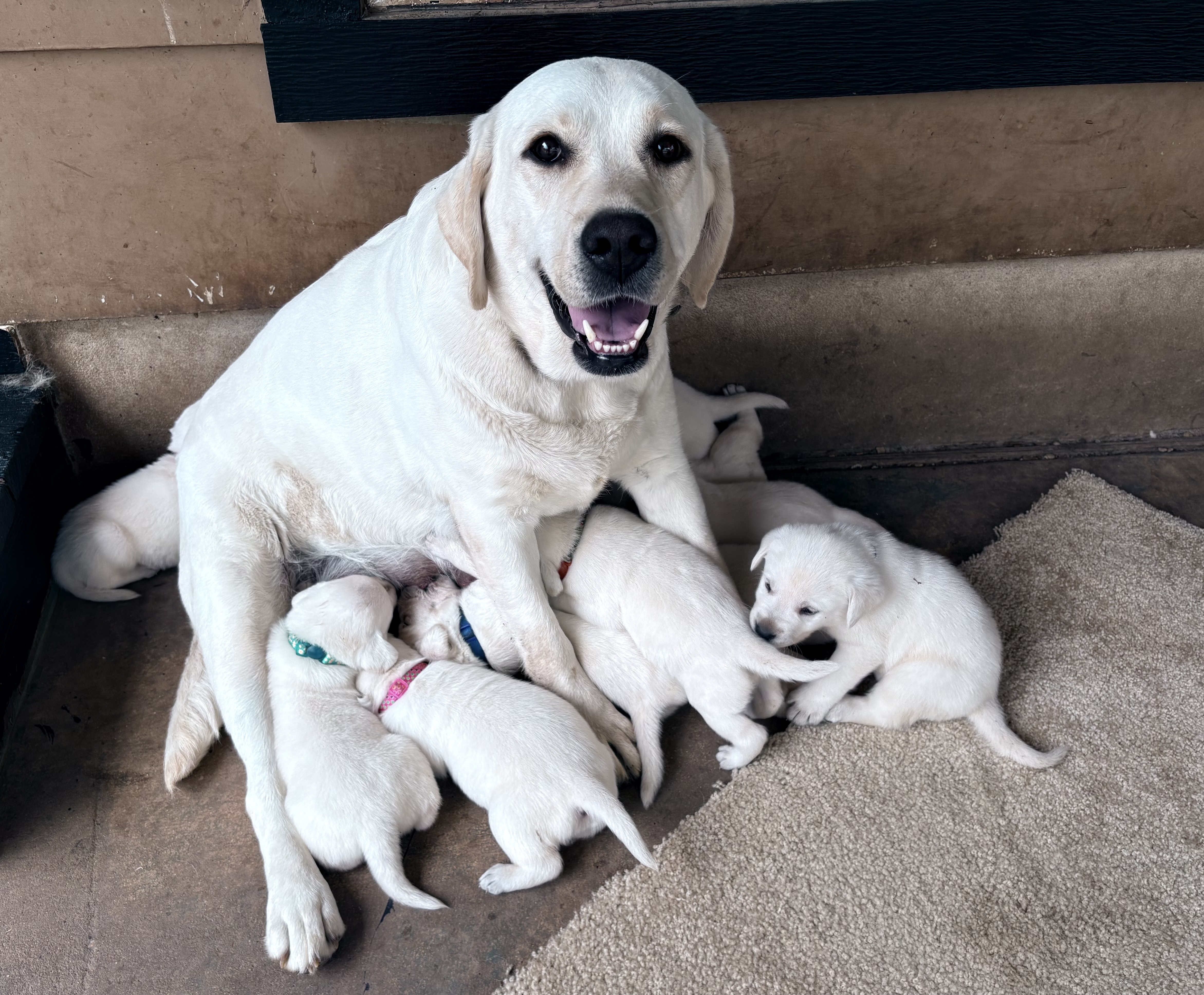 Puppies are getting so big, the Mamas are sitting up now when they let them nurse. It won’t be long and they won’t let them up to the milk bar at all. They are all eating puppy chow now.