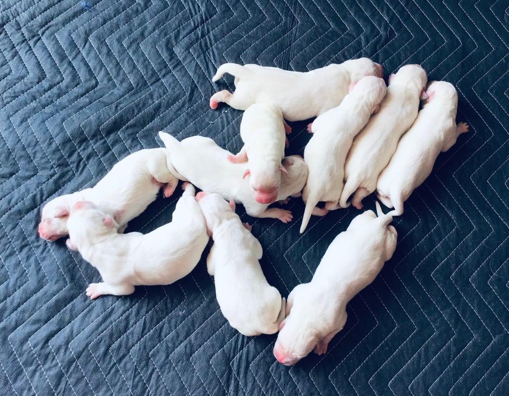 New update on what we have available. There are 2 males available in Lucy & Jaxon’s litter ready Aug. 5th. Also we have four female puppies that were just born from Callie & Griffey’s litter.They are pictured below, ready August 25th. So get in touch with me I am sure we have what you are looking for.