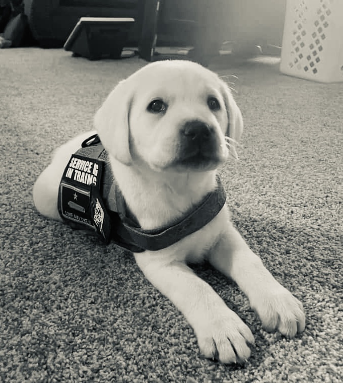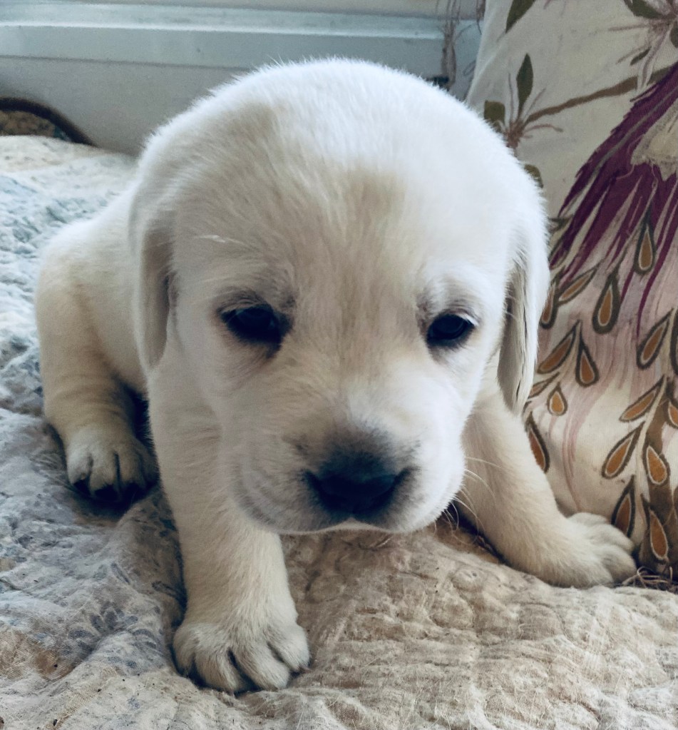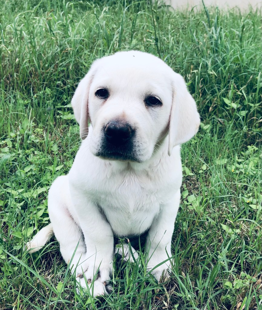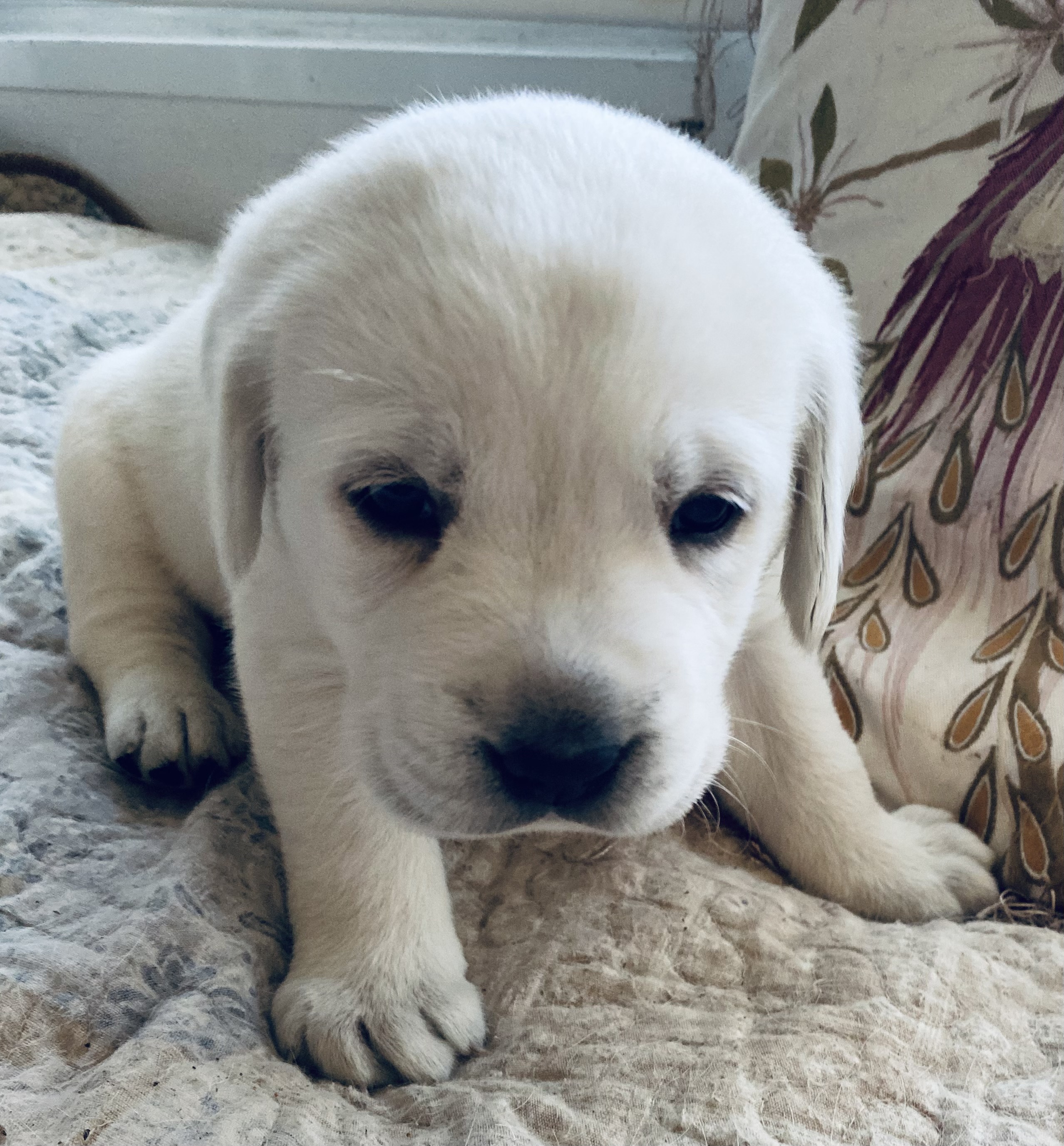Here is one of my white labs that is in training to become a service dog. The possibilities of what these smart dogs can do is limitless. I have five females and two males that are available for pick up in July.